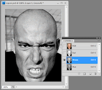 4 - Trên LAYERS Panel (bảng layer),click vào biểu tượng con mắt trên Layer 1 để ẩn layer này.Chuyển sang CHANNELS Panel,click lần lượt từng kênh Red,Green, Blue (click vào tên kênh,không nên click vào biểu tượng con mắt) để tìm xem thông tin trên kênh nào là rõ nhất.Trong trường hợp này tôi chọn kênh Green.