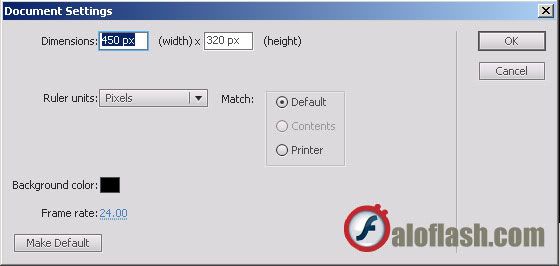 Tạo 1 file tài liệu Flash mới, nhớ chọn nó là file ActionScript 1.0 nhé. (Ctrl + N) chọn loại ActionScript 1.0. Sau đó bạn nhấn Ctrl + J để mở bảng tùy chọn làm việc thiết lập Background Color là màu đen.