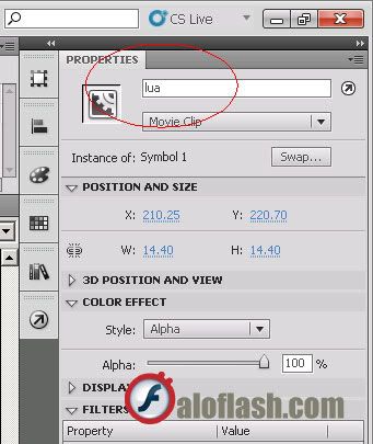 Chọn công cụ Selection Tool (V) click vào movie clip này bạn sẽ thấy bên phải có bảng Color Effect như hình dưới bạn chọn Advanced.