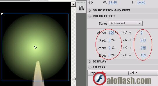Click frame 25 nhấn F6 để chèn keyframe tương tự bước 7 sử dụng công cụ Free Transform Tool (Q) kéo nhỏ hình tròn lại, Chọn công cụ Selection Tool (V) click vào movie clip này bạn sẽ thấy bên phải có bảng Color Effect như hình dưới bạn chọn Advanced. Thiết đặt thông số như hình dưới nhé: