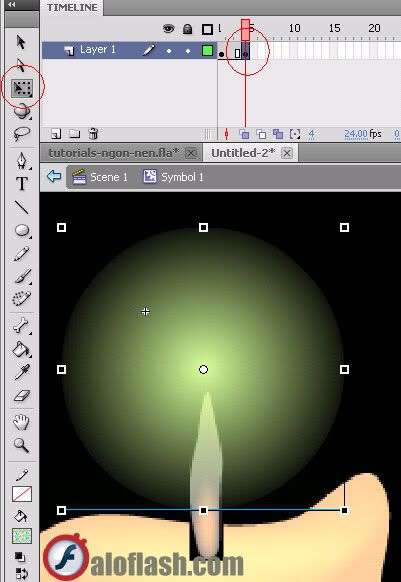 Nhấn Ctrl + để phóng to flash lên, sử dụng công cụ Oval Tool (O) vẽ 1 hình tròn nhỏ phía đỉnh cây nến như hình (chú ý những phần mình khoanh đỏ).