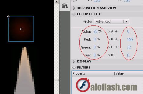 Chọn công cụ Selection Tool (V) click vào movie clip này bạn sẽ thấy bên phải có bảng Color Effect như hình dưới bạn chọn Advanced. Thiết đặt thông số như hình dưới nhé: