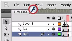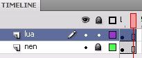 Giờ chúng ta đã ra ngoài, ta có 2 layer: Layer nến là hình cây nến, và layer lửa là layer bạn vừa làm. Click lần lượt vào frame thứ 3 của 2 layer này lần lượt nhấn F5 ta sẽ được như hình: