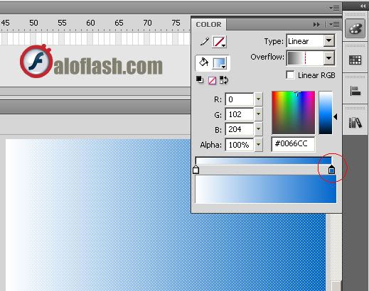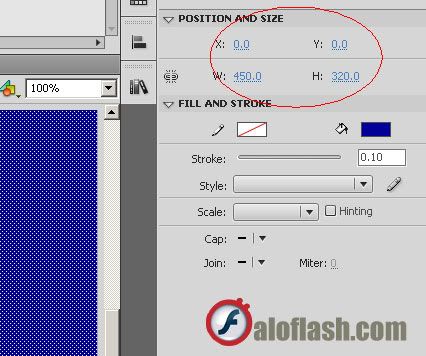 Sử dụng công cụ Rectangle Tool (R), vẽ một hình chữ nhật vừa với khung hiển thị của flash (ta sẽ làm nền cho flash này), như vùng mình khoanh tròn ở hình dưới, các bạn vẽ khung chữ nhật sau sẽ đánh thông số vào như vậy (tọa độ X và Y là để 0 và 0 và chiều rộng chiều cao bằng thông số tài liệu flash của bạn).