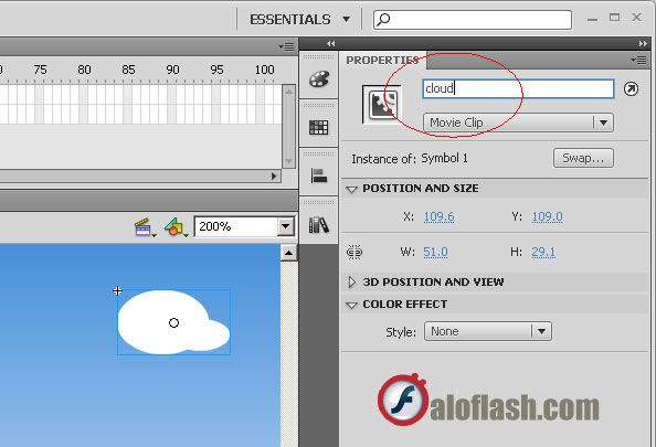 Sử dụng công cụ Selection Tool (V), click vào hình đám mây vừa vẽ nhấn phím F8 để convert nó thành dạng Movie Clip. và đặt tên cho Clip này là: cloud