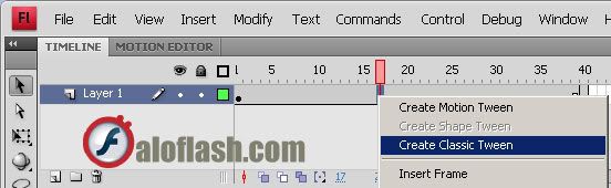 Click vào bất cứ nơi nào giữa frame 1 và frame 40 chọn Create Classic Tween.