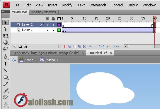 Clip đúp vào movie Clip vừa tạo để vào bên trong, dùng công cụ Selection Tool (V) click chọn đám mây và lại Covert nó thành movie Clip bằng cách nhấn F8 chọn movie clip. Click vào frame thứ 40 nhấn phím F6 để chèn thêm Keyframe, sử dụng công cụ Free Transfrom Tool (Q) kéo to đám mây ra và kéo nó di chuyển chéo lên bên trái (như thể đám mây sẽ bay từ thấp lên cao).