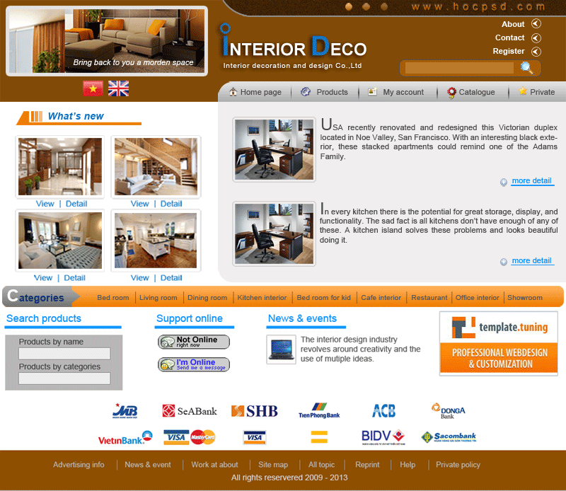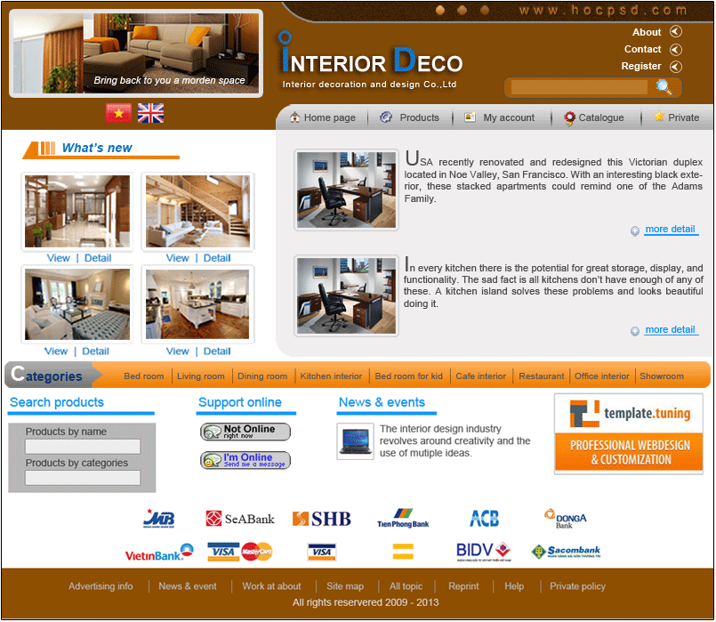 1 - Mở lại file template header đã lưu lại trong phần 1,tìm layer 11 và cho nó hiện trở lại.Mở thêm file tư liệu ( hình phòng làm việc) đã chuẩn bị sẵn,dùng công cụ Move kéo file này thả vào file template và đặt lại vị trí như hình minh họa.Khi đặt file tư liệu "hình phòng làm việc" này vào file template thì Photoshop tự đặt tên cho layer.Trong bài hướng dẫn này,trước khi cho thêm file hình tư liệu vào thì trong bảng layer đã có layer 18 nên khi đặt vào nó sẽ tự động tạo ra layer 19.