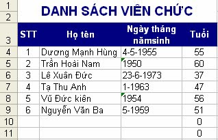 Bạn sẽ thấy việc nhập dữ liệu trong cột ngày tháng năm sinh rất lộn xộn, tùy tiện không thống nhất, trong bảng tính này tồn tại 3 dạng dữ liệu:
